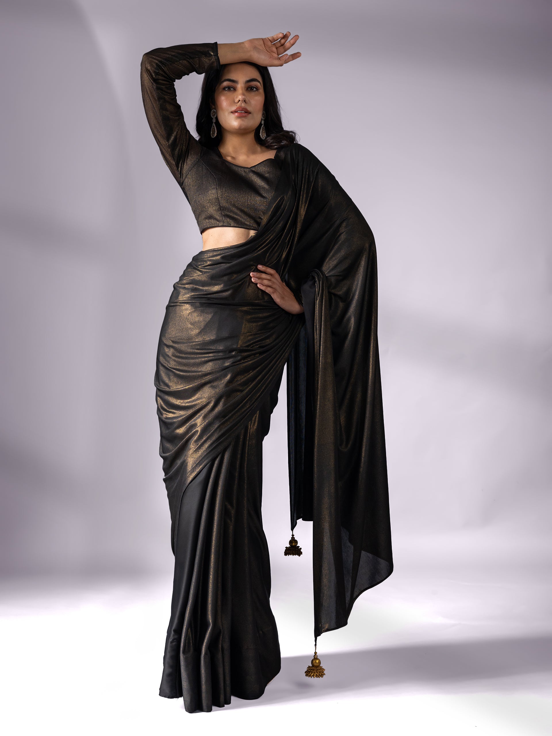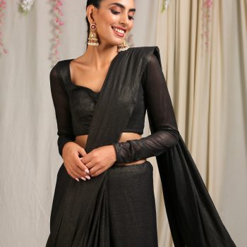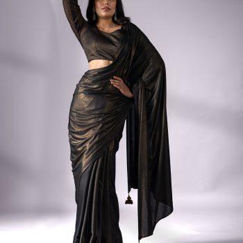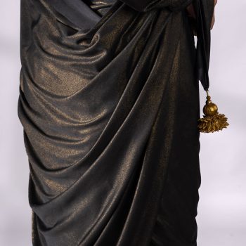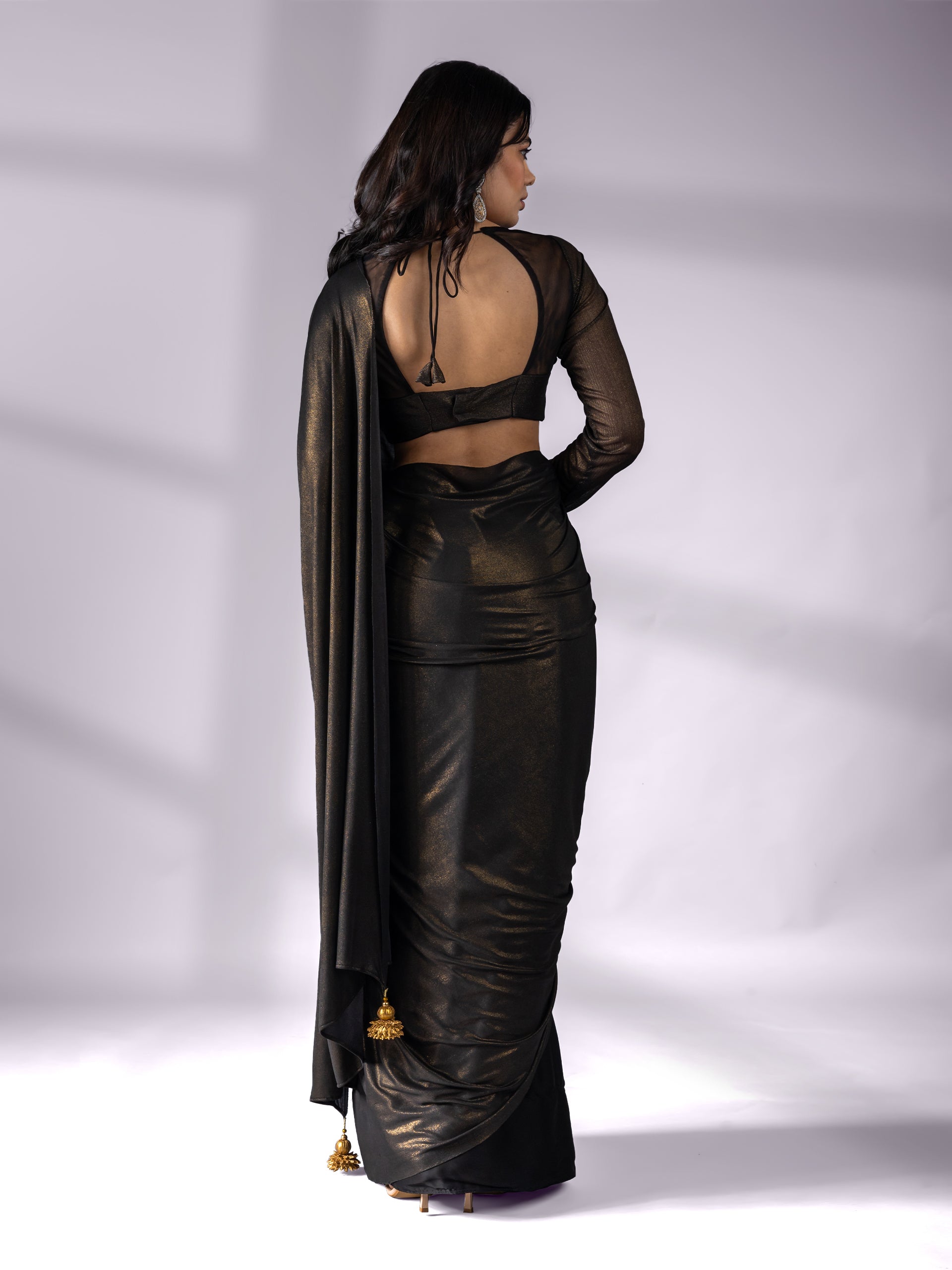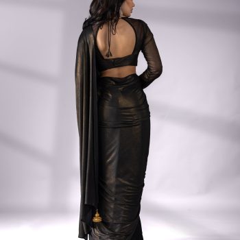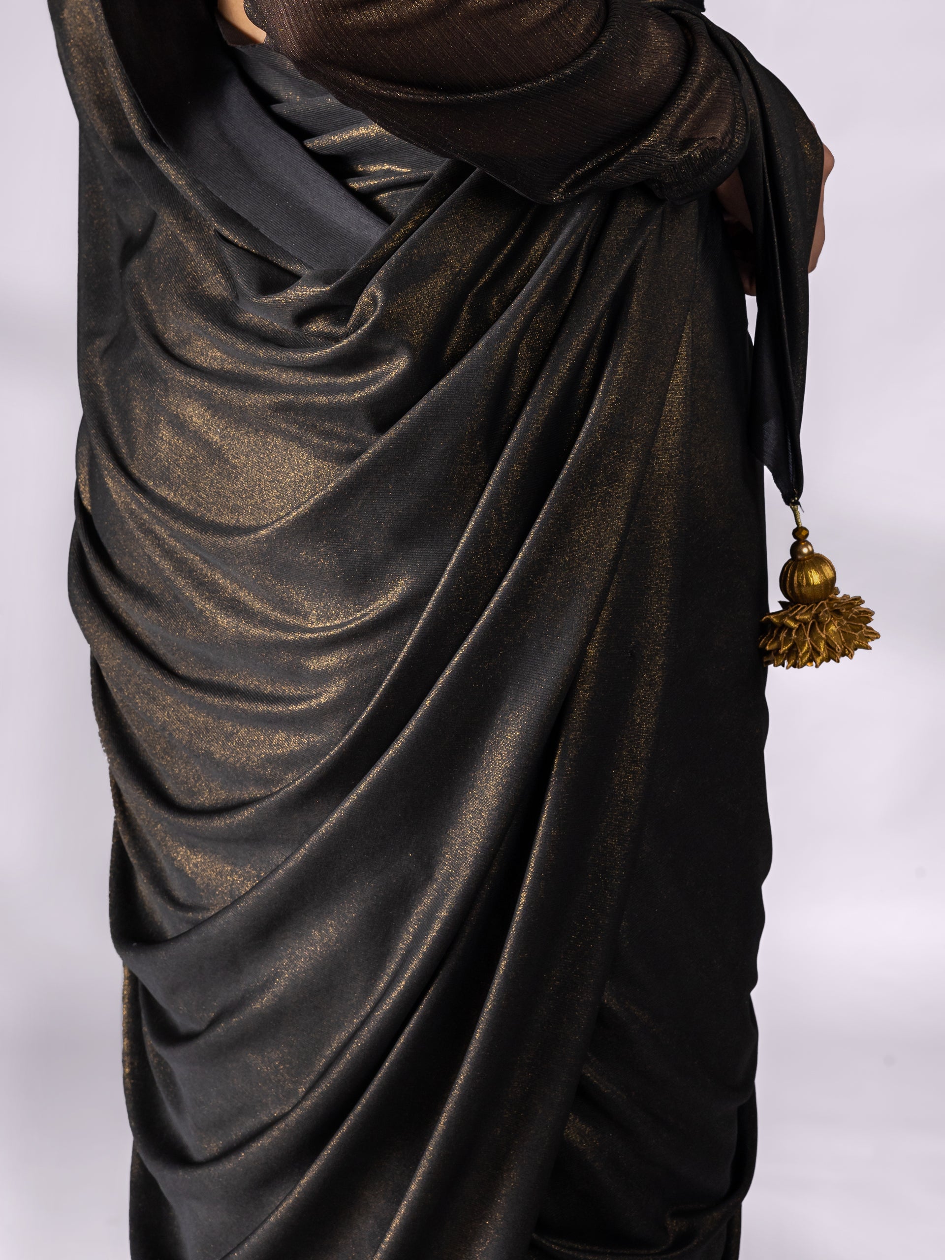 Colour:?Black?Saree with gold sheen. End on Pallu?has hand made a dull gold pendants.